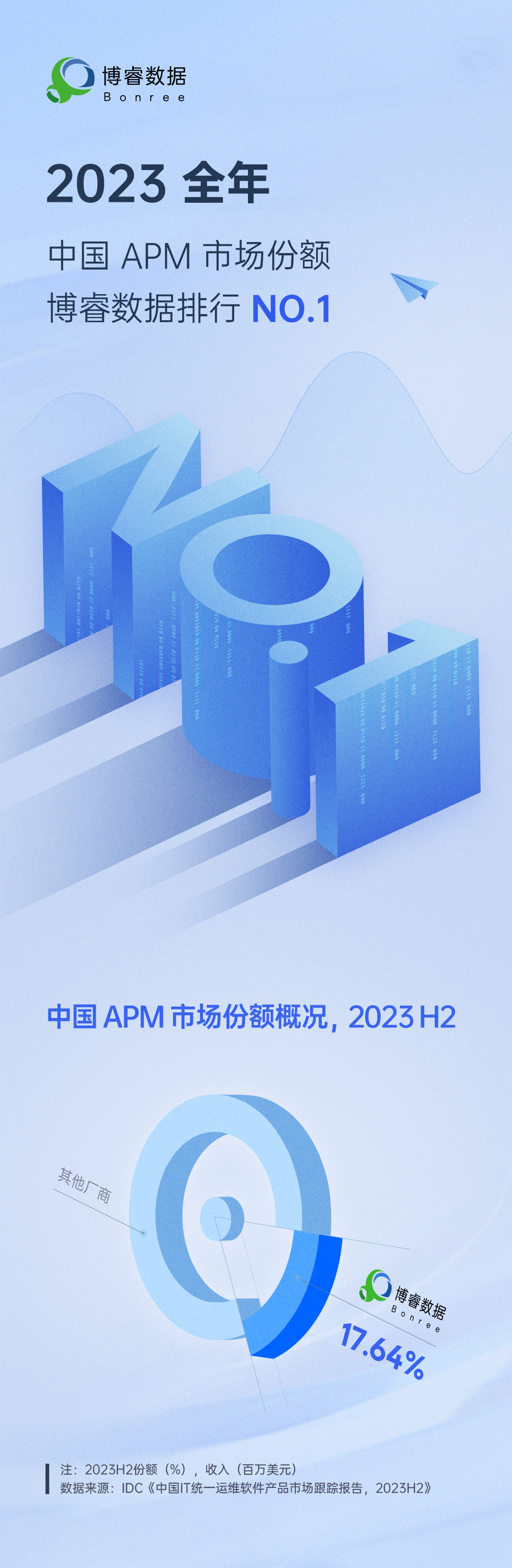 近日,全球领先的IT市场研究和咨询公司IDC发布《中国IT统一运维软件产品市场跟踪报告,2023H2》。报告显示,2023下半年博睿数据以 17.6%的市场份额蝉联 APM(应用性能监控)市场第一。2023年全年博睿数据以18.8%的市场份额持续领跑中国APM市场。